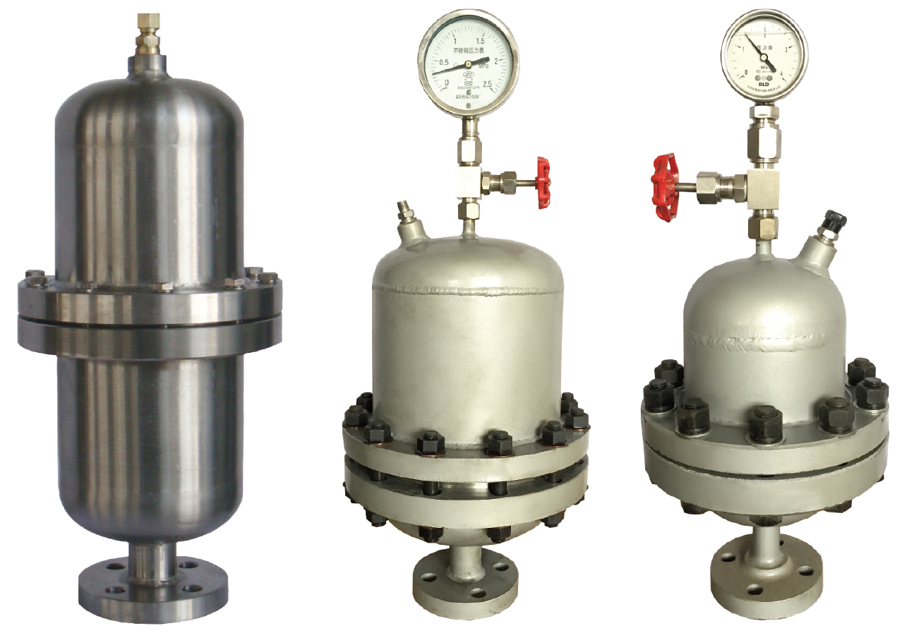 我公司獲得國家發(fā)明專利 ( 專利號:ZL 2015 1 0258493.3) 的 隔 膜 式 緩 沖 器,其能有效吸收管路中的液體慣性力,平緩壓力脈沖,使輸出的流量均勻,避免管路產(chǎn)生共振,改善泵的輸送性能。特別是在一些氣液接觸式或囊式緩沖器不能適用的場合,因其采用 PTFE(聚四氟乙烯)膜片隔離輸送的液體和氣腔的壓縮氣體,幾乎能耐所有的介質(zhì)。
